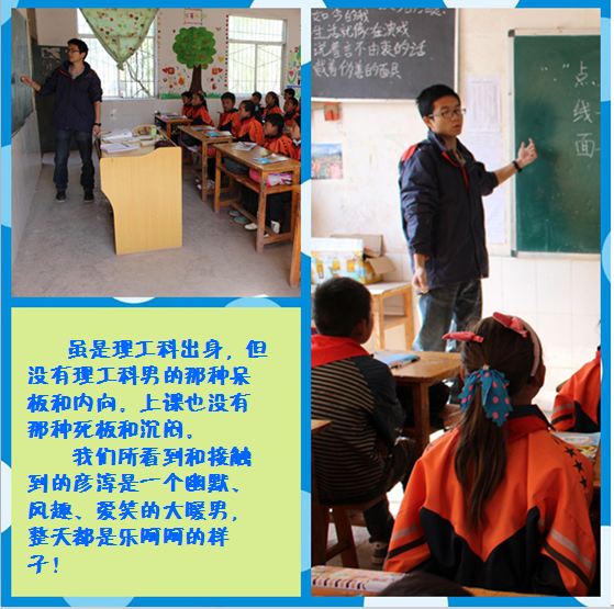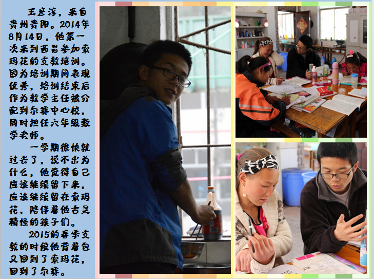 王彦淳,来自贵州贵阳的阳光男孩,一天到晚都是乐呵呵的。2014年下期来到索玛花,培训后被分配到越西县尔赛乡支教,为了他那群古灵精怪的孩子们,今年他继续留下来,陪伴他们直到毕业。他说:来过这里,遇见过这群孩子,这就是最幸运的事情。