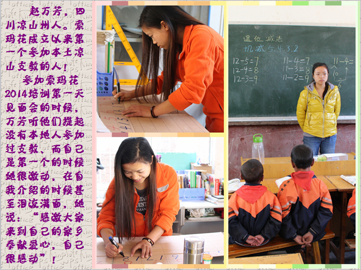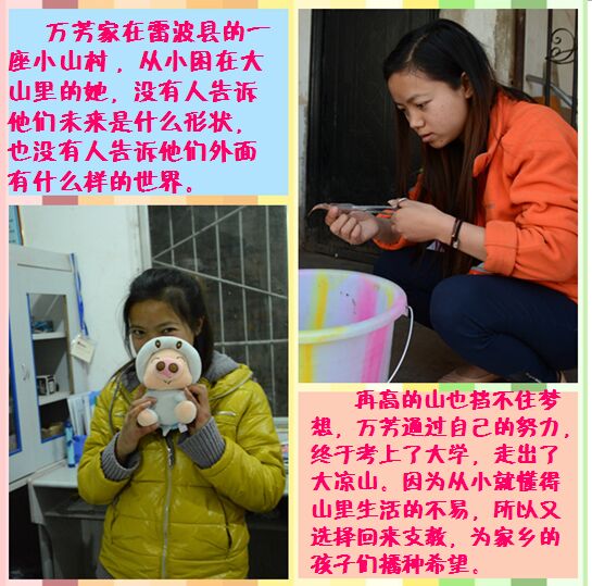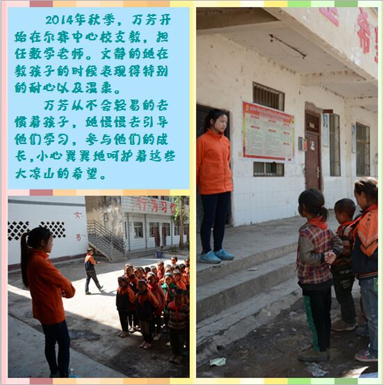 赵万芳,来自四川省凉山州雷波县,是基金会成立以来,第一个来自凉山本地的支教老师。从小在大山里长大的她,凭着自己的努力考上大学,走出了大山;又因为那份爱心,毕业后重新回到了大山的怀抱来支教,用自己的青春,为家乡的孩子们播撒希望。