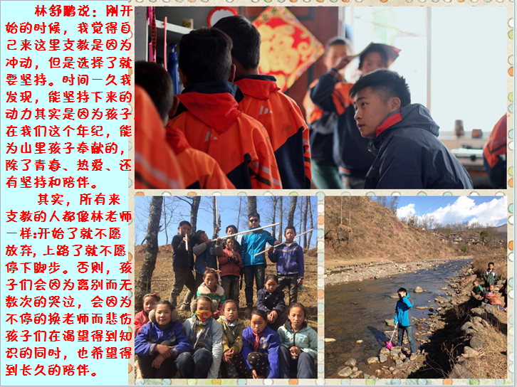 阳光帅气的林舒鹏,是来自湖南株洲的93后男孩,2014年12月30日来到索玛花参加支教。他说:自己因为冲动而来到了索玛花,但是来了以后为了孩子们而选择了坚持,在我们这个年纪,能为山里孩子奉献的,除了青春、热爱,还有坚持和陪伴。