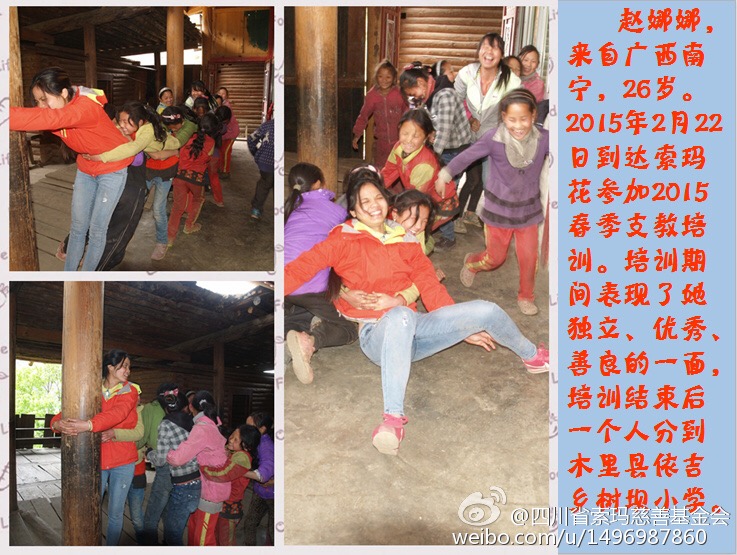 赵娜娜,来自广西南宁。2015年2月22日到达索玛花参加2015春季支教培训。培训期间表现了她独立、优秀、善良的一面,培训结束后一个人分到木里县依吉乡树坝小学。两周以后从树坝小学转到依吉乡另一个学校——麦洛小学。支教总是让人变得更加成熟懂事,娜娜加油!