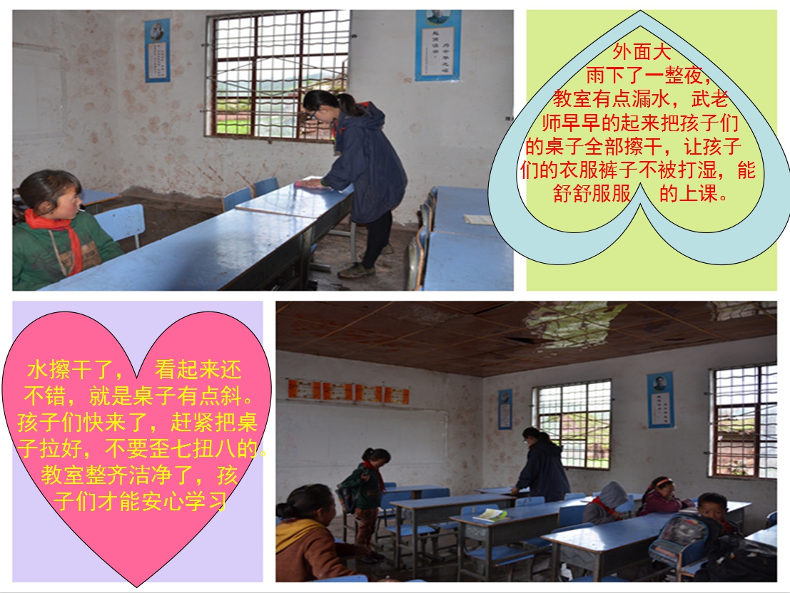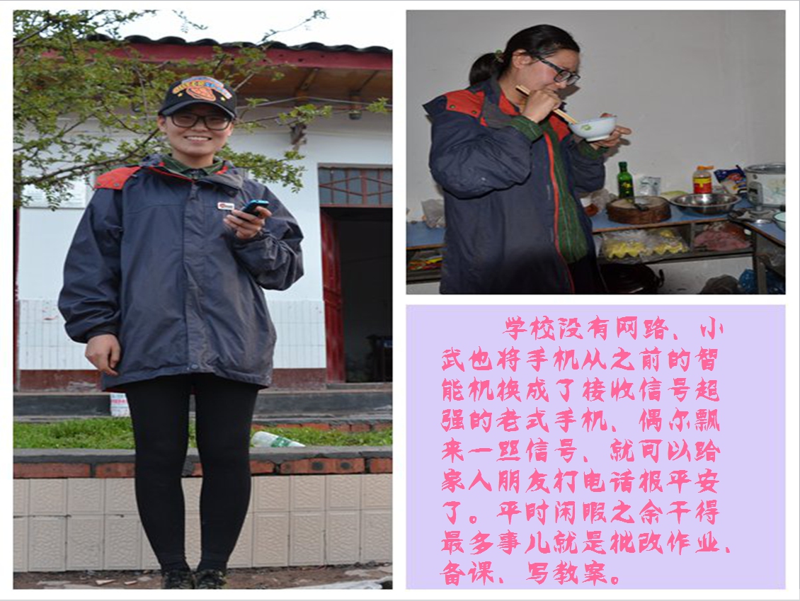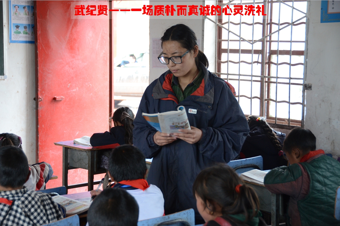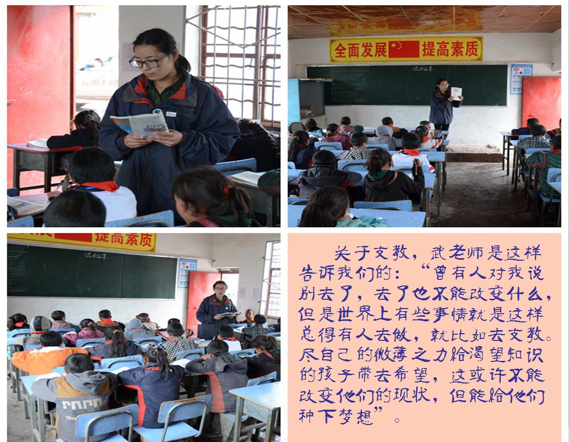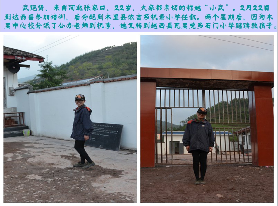 武纪贤,来自河北张家口,22岁,大家都亲切的称她“小武”。2月22日到达西昌参加培训,后分配到木里县依吉乡机素小学任教。两个星期后,因为木里中心校分派了公办老师到机素,她又转到越西县瓦里觉乡石门小学继续教孩子。