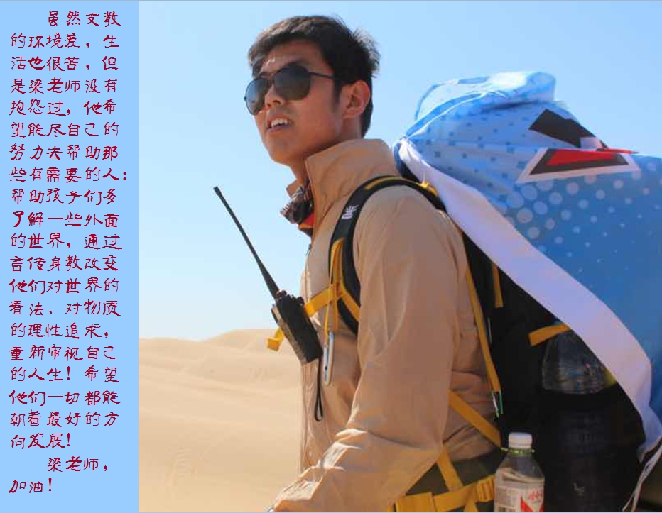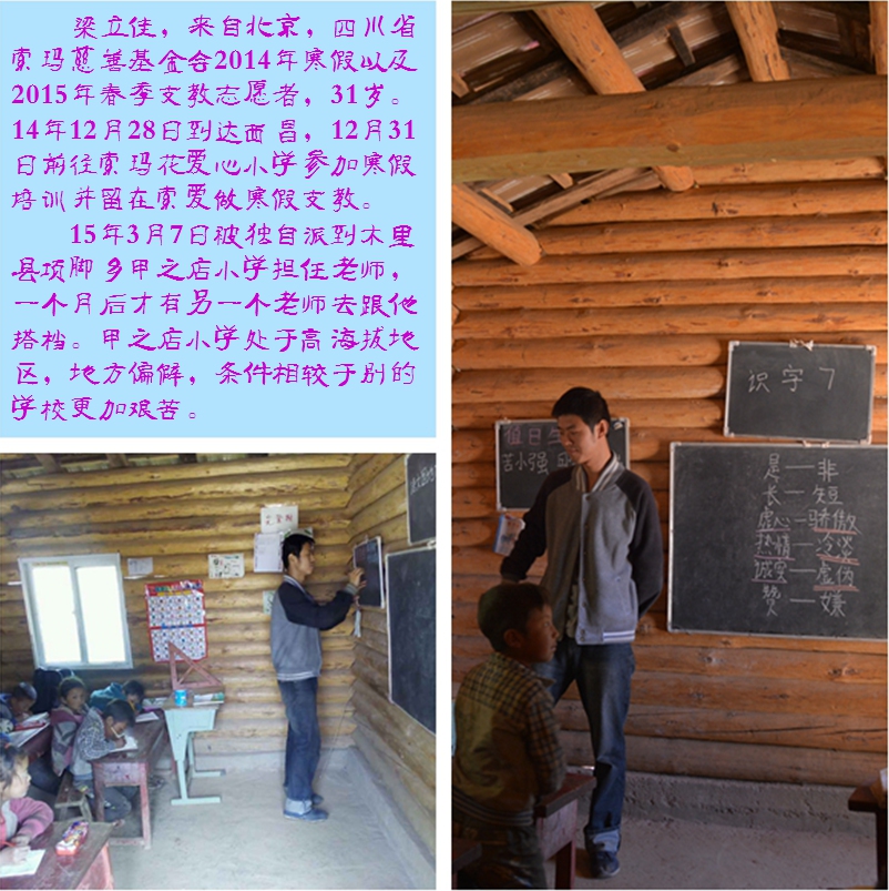 梁立佳,来自北京,四川省索玛慈善基金会2014年寒假以及2015年春季支教志愿者,31岁。2014年12月28日到达西昌,12月31日前往索玛花爱心小学参加寒假培训并留在索爱做寒假支教。2015年3月7日被独自派到木里县项脚乡甲之店小学担任老师。