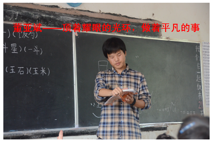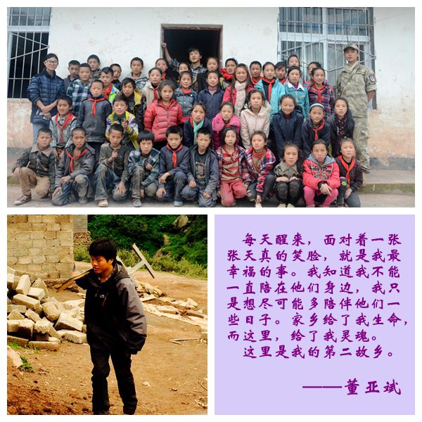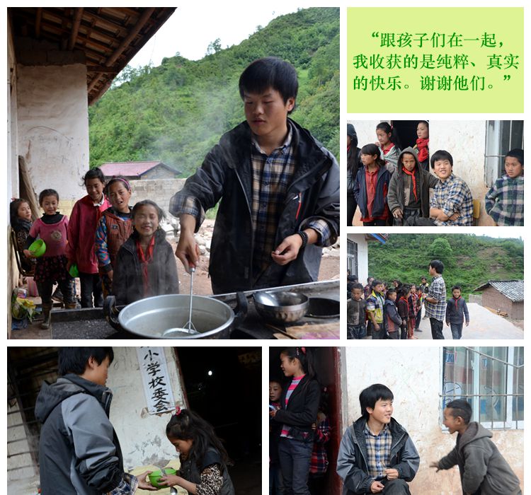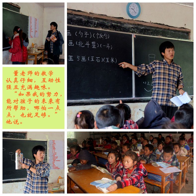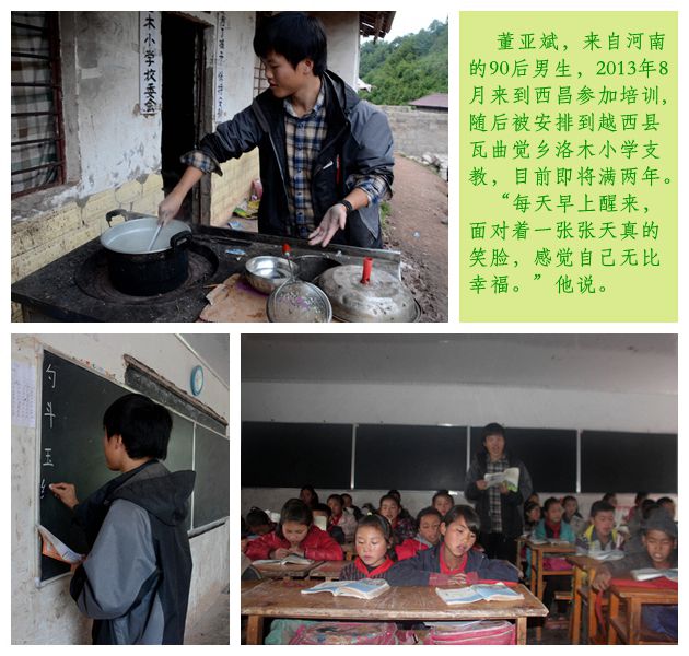 董亚斌,来自河南的90后男生,2013年8月来到西昌参加培训,随后分配到越西县瓦曲觉乡洛木小学,目前即将支教满两年。他说:“每天早上醒来,面对着一张张天真的笑脸,感觉自己无比幸福。”加油,亚斌!
