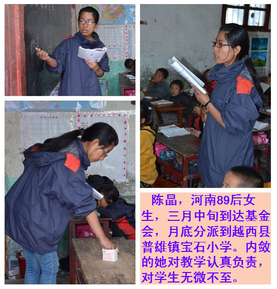 陈晶,河南89后女生,三月中旬到达基金会,月底分派到越西县普雄镇宝石小学。内敛的她对教学认真负责,对学生无微不至。 选择支教,不为享乐,不为名利,也不为避世,只算作一场修行。纵有千山阻,何惧万里遥! 加油,陈晶!