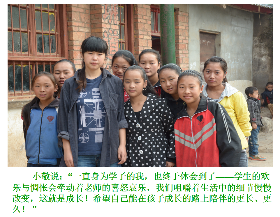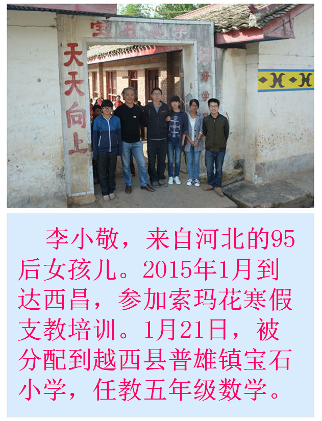 李小敬,来自河北的95后女孩儿。2015年1月到达西昌,参加索玛花寒假支教培训。1月21日,被分配到越西县普雄镇宝石小学,任教五年级数学。希望自己能在孩子成长的路上陪伴的更长、更久。