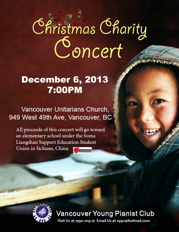 由加拿大温哥华青少年钢琴家俱乐部主办的圣诞慈善晚会,于2013年12月6日,在温哥华第49大道—温哥华神论教堂圆满结束。。。共筹集善款6340加元,折合人民币约36000元,款项将用于购买棉被,12月底前送到凉山贫困地区的孩子们手中。。。感恩海外的志愿者们,心系祖国贫困儿童,血浓于水!。。。索玛花将全程报告这次物资的运送和捐赠情况。