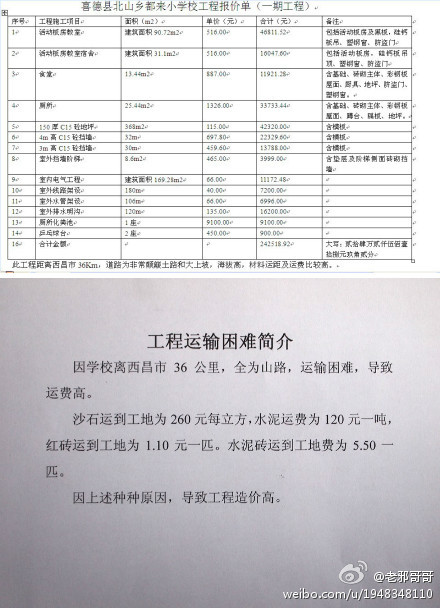 2月27日都来小学第一期工程报价为242518.92元。经过砍价实际价格为23万元。喜德县北山乡中心校和施工方签合同,并监督验收整个工程。凉山州索玛花支教助学联盟在工程验收合格后付款。