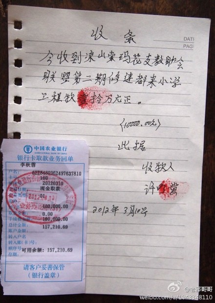 (下图为将10万元修建都来小学的工程款,交给许明黄)