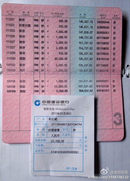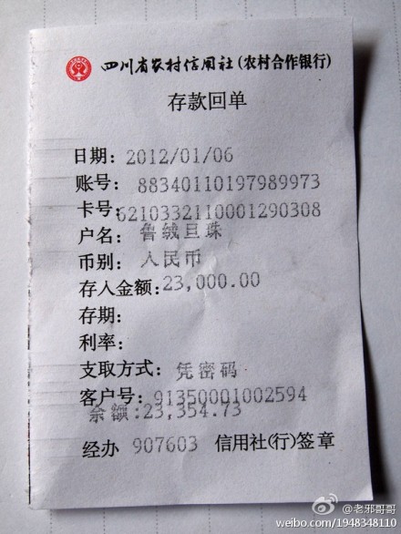 2012年1月7日是个难忘的日子,应该被记住!今天从爱心账户支取的23000元是@翁涛yt捐给木里县麦日乡克米小学修建的,取出来以后立即转给了校长鲁绒旦珠。