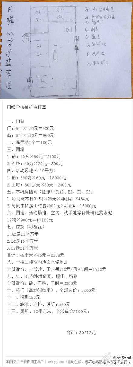 日喔小学2012年修建开支清单总金额:92226元。经手人:日龙村日窝组白保空撒降勇日丁。日喔小学原始工程报价为80212元,详情请看我5月10日长微博。经中心校校长鲁绒旦珠和当地修建日喔小学的村民多方面协商,我们最终支付费用为79300元。,@闲云野鹤1018 首次支付70000元,工程完毕后支付9300元。