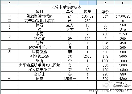课桌已经找好友搞定,应该说是成本价给我们。双人课桌宽40CM,长110CM,高74CM,中密度纤维板,木条凳,每套180元,我先预定50套,视报名情况再增加,运到火普小学的费用是300元。另外土建和板房造价的预算这两天就会做出来。