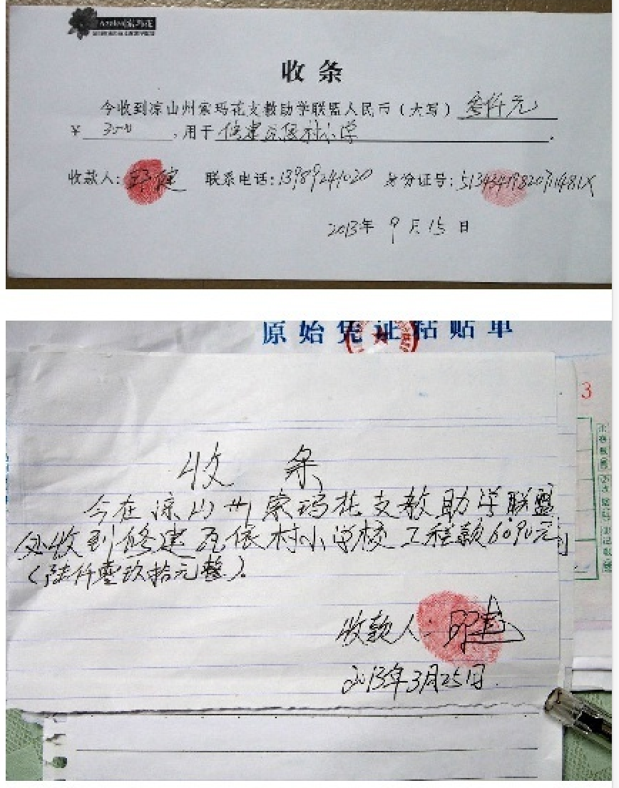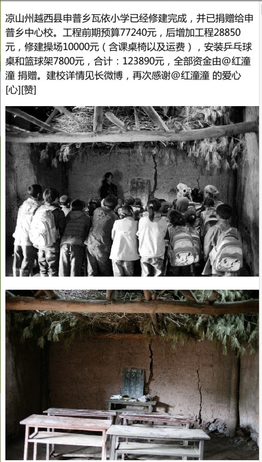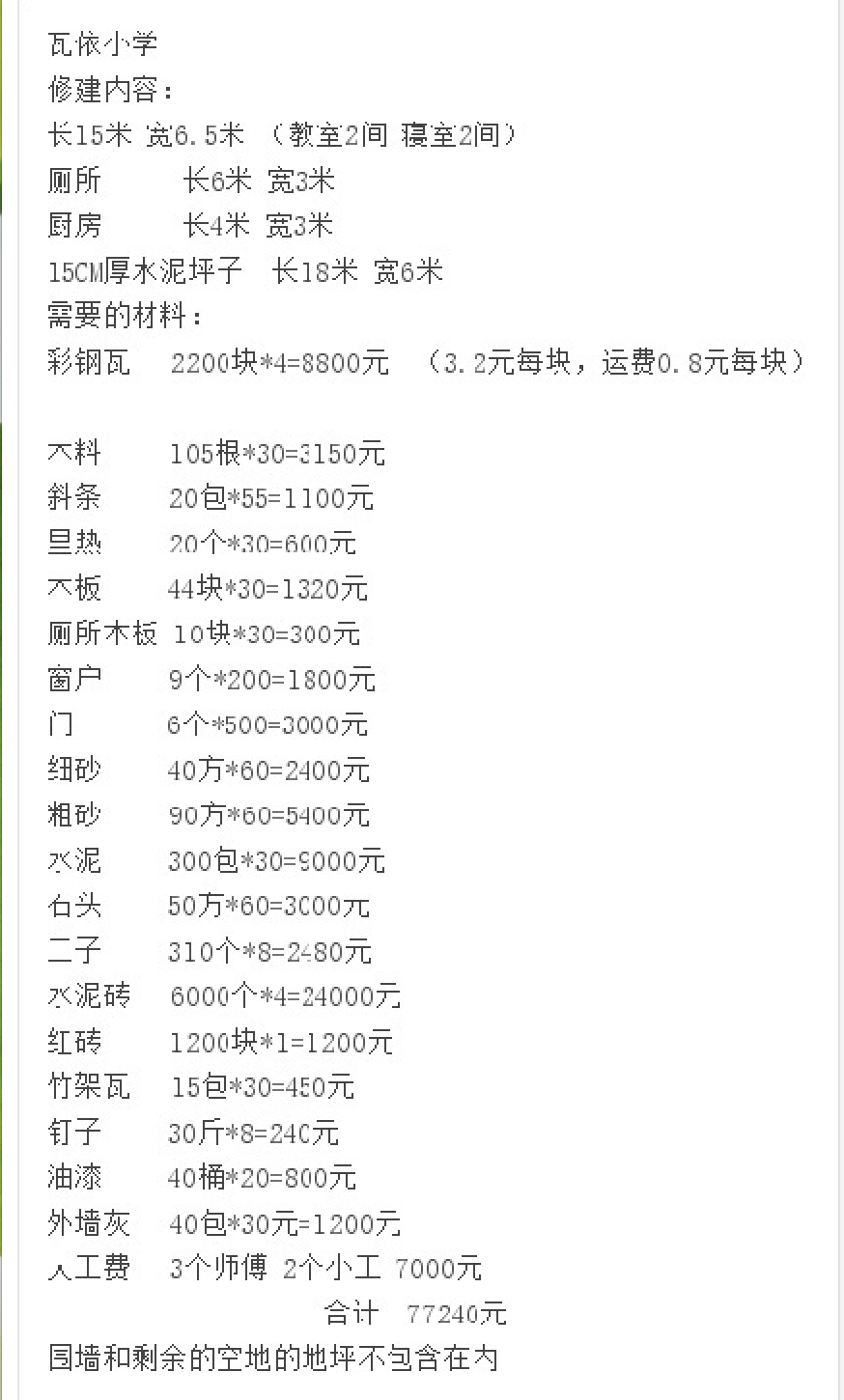 瓦依小学已经修建完成,并已捐赠给申普乡中心校。前期预算77240元,后增加工程28850元,修建操场10000元(含课桌椅以及运费),安装乒乓球桌和篮球架7800元,合计:123890元,全部资金由@红潼潼 捐赠。建校详情见长微博,再次感谢@红潼潼 的爱心