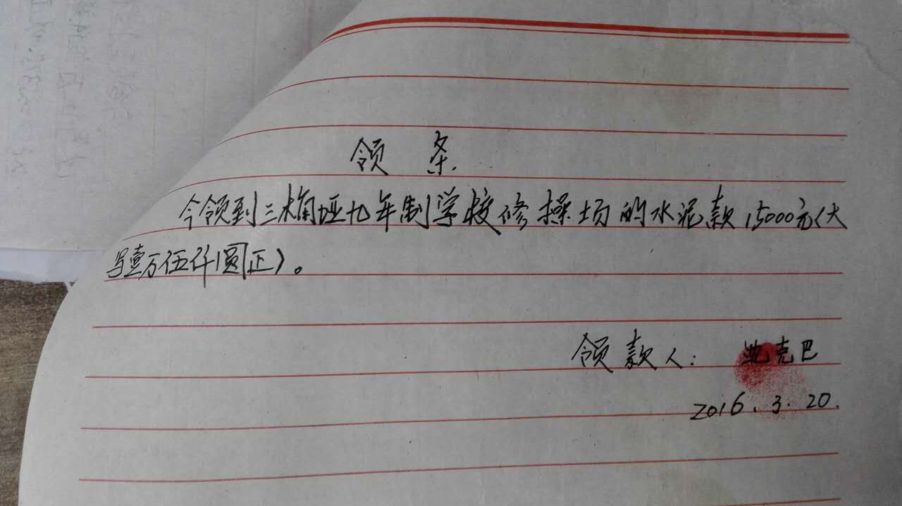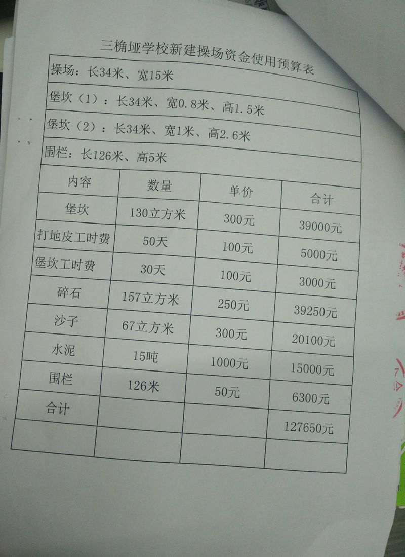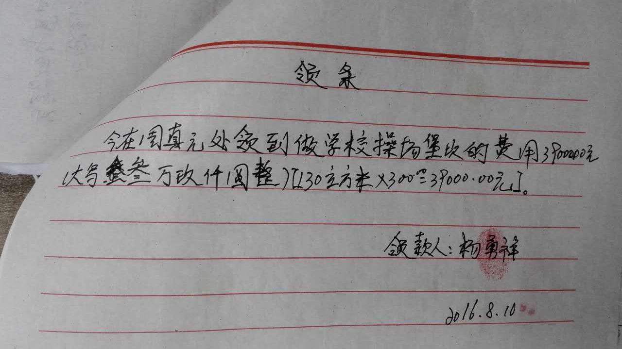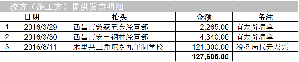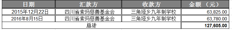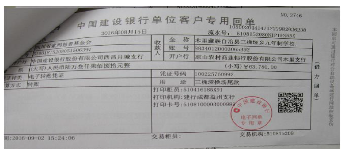 截至2016年8月15日,修建操场所需款项: 127605元,已全部汇给校方