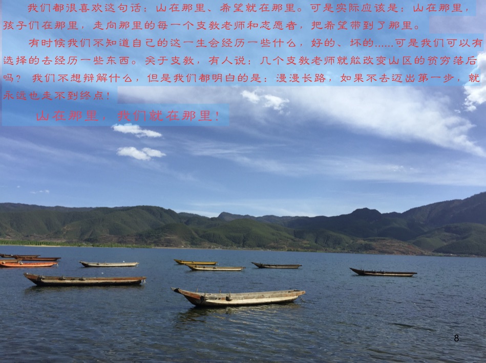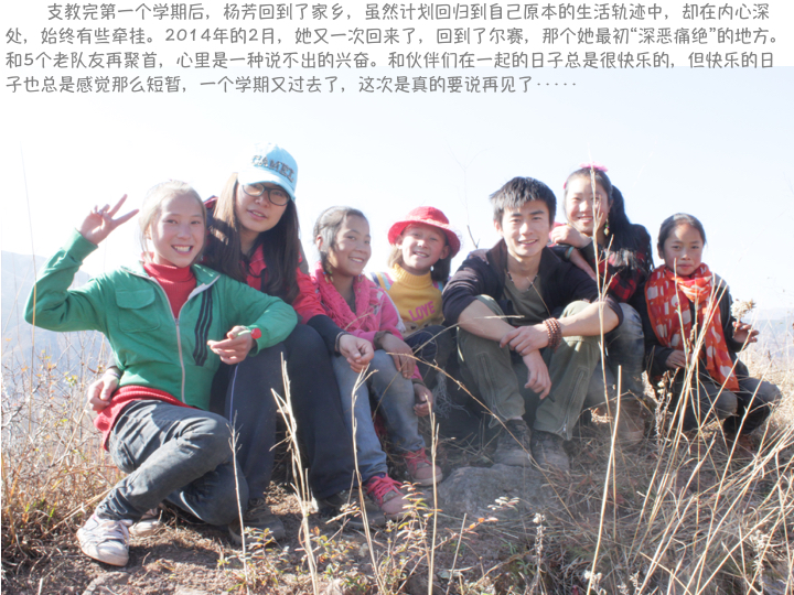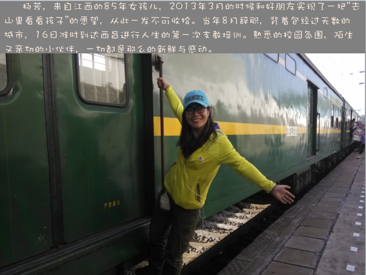 杨芳,来自江西萍乡的85后女孩,自一次“到山里看看孩子”的旅行之后,调整了自己的人生轨迹。从2013年起,三次到凉山来支教,为了孩子,选择了这种纯粹、简单的生活。她说:支教并不是我最初的梦想,却是我选择的一种生活方式。